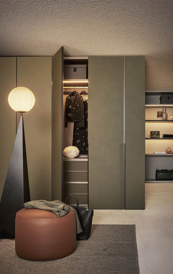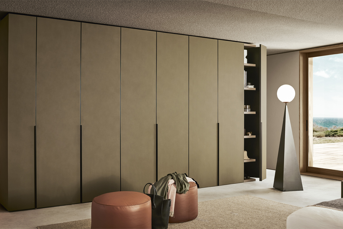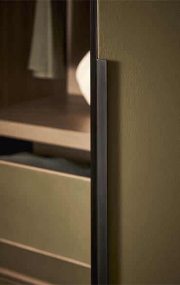 The slim, uninterrupted line of the frame draws a discreet and minimal outline. In lacquered or black anodized aluminium, it punctuates the run of vertical modules or tends to blend in when coordinated with the surface finish of the doors available in lacquered glass, mirror, wood and textured finishes as well as man-made leather and matt or gloss lacquers. Long and slightly angled, the handle is designed to form a line that carries on from the frame, giving the door an elegant, linear appeal and offering an excellent grip to any type of hinged, sliding and flush sliding door.