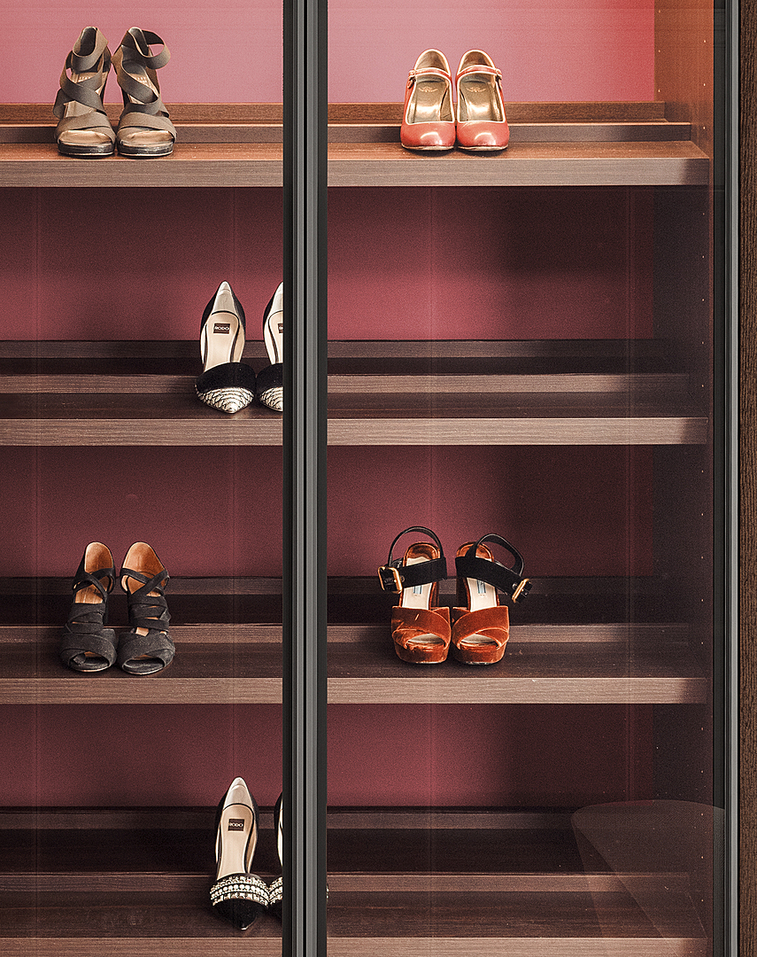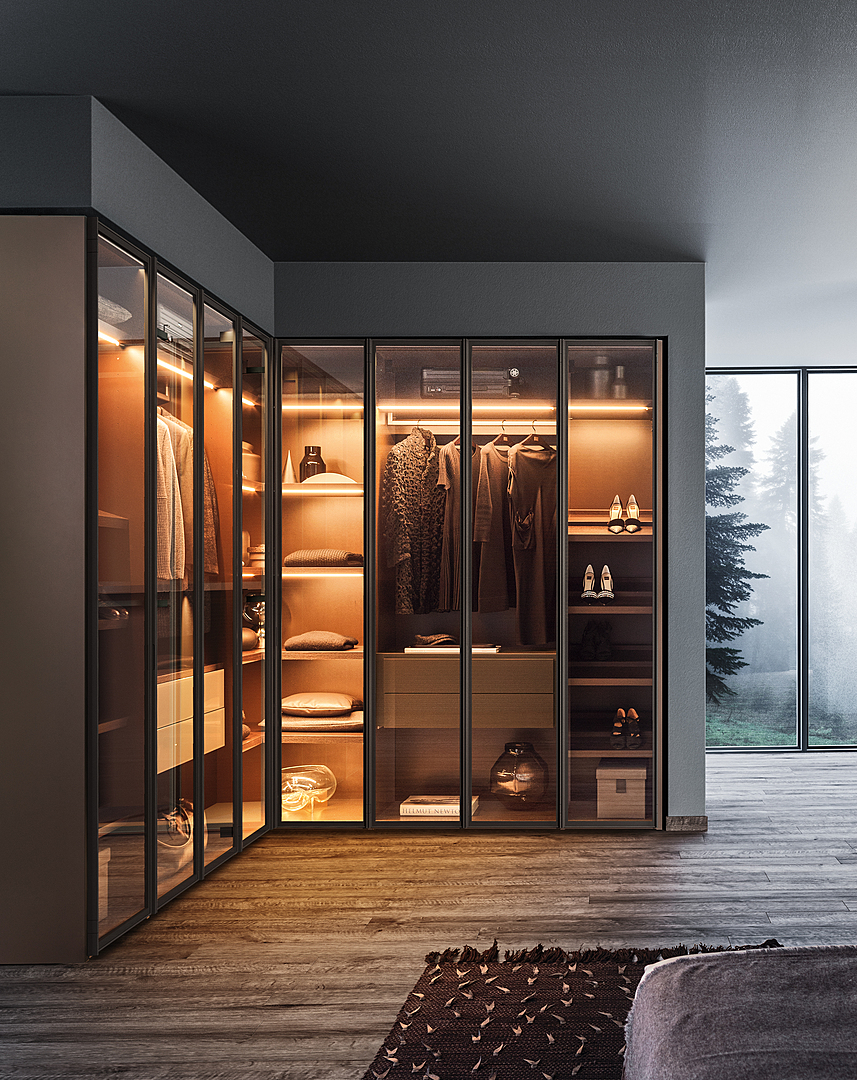 Just as if they were arranged in a personal boutique, your objects and garments must be enhanced and exhibited with elegance and order. The glass doors, defined by a Gunmetal Grey or metallized brown frame, set off and add a finishing touch to arrangements. The visible interior accessories show off their great ability to efficiently organised spaces with style. The hinged doors come with special pivot hinges that can open at a 180° angle.
