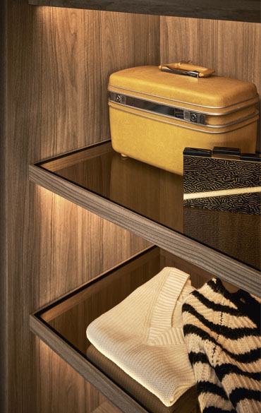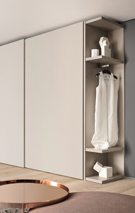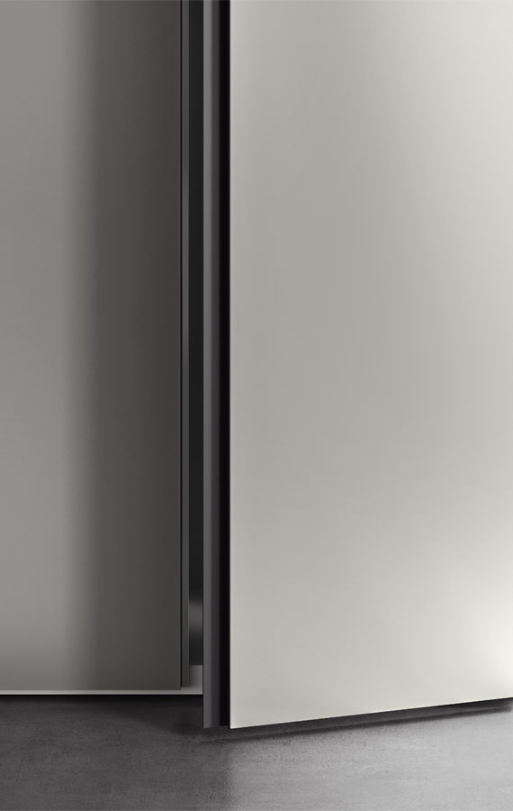 The understated and delicate style of simplicity meets the ultimate in expressiveness and customization. Nastro offers a vast range of finishes and special solutions to satisfy any aesthetic or functional request: external drawer unit module, bridging module, unit installed above doors, TV unit, open end unit as well as custom-sized solutions. Recessed in the doors, the aluminium, full-height handles draw channels in lacquered colors or in shiny metal finishes.