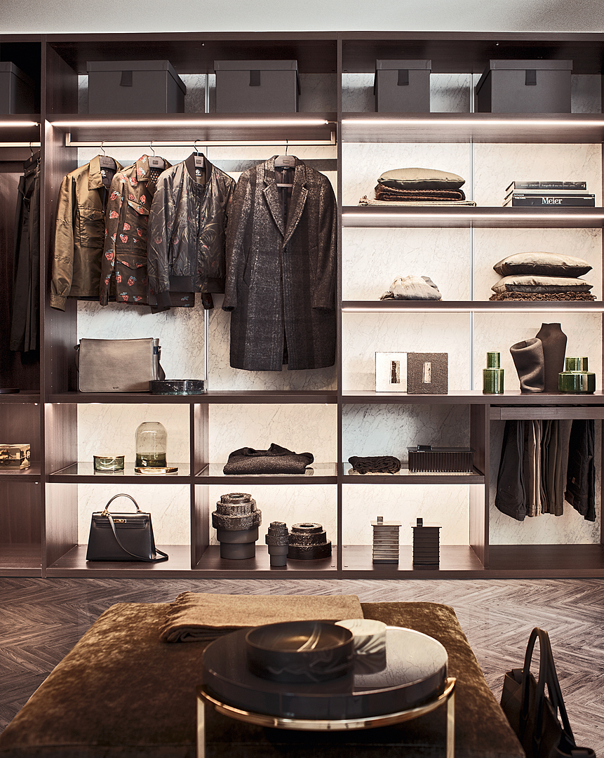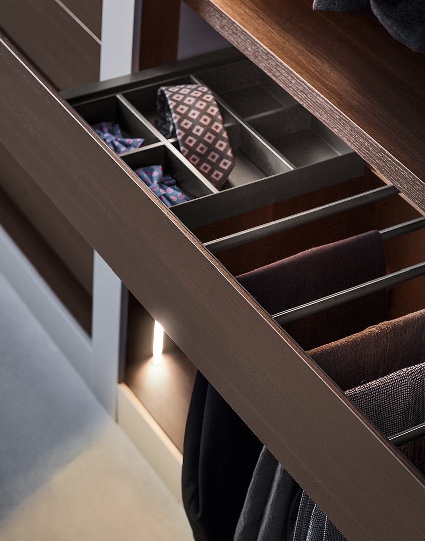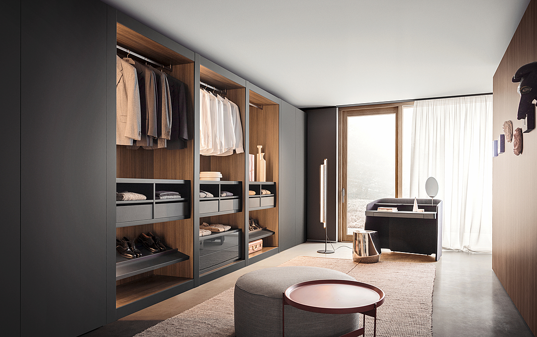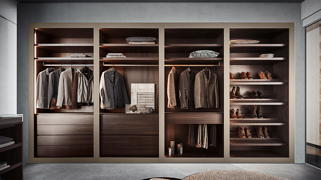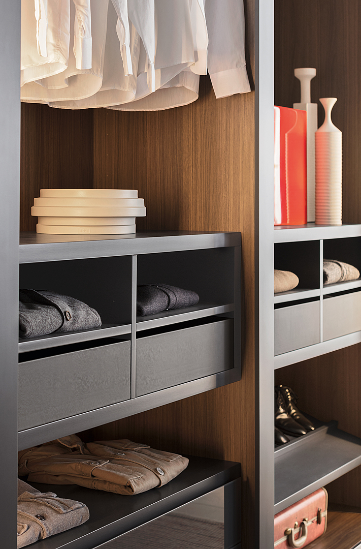 Curtains dissolve to reveal elegance, order and refinement on stage. Sipario is made up of wardrobe modules without doors that can be unrestrictedly put together to suit individual practical requirements and aesthetic preferences. In the framed version, the vast array of finishes is enhanced by a wide frame that gives the arrangement an even warmer and more sophisticated appeal. To satisfy any requirement, our range of interior accessories is the same available for our wardrobes.