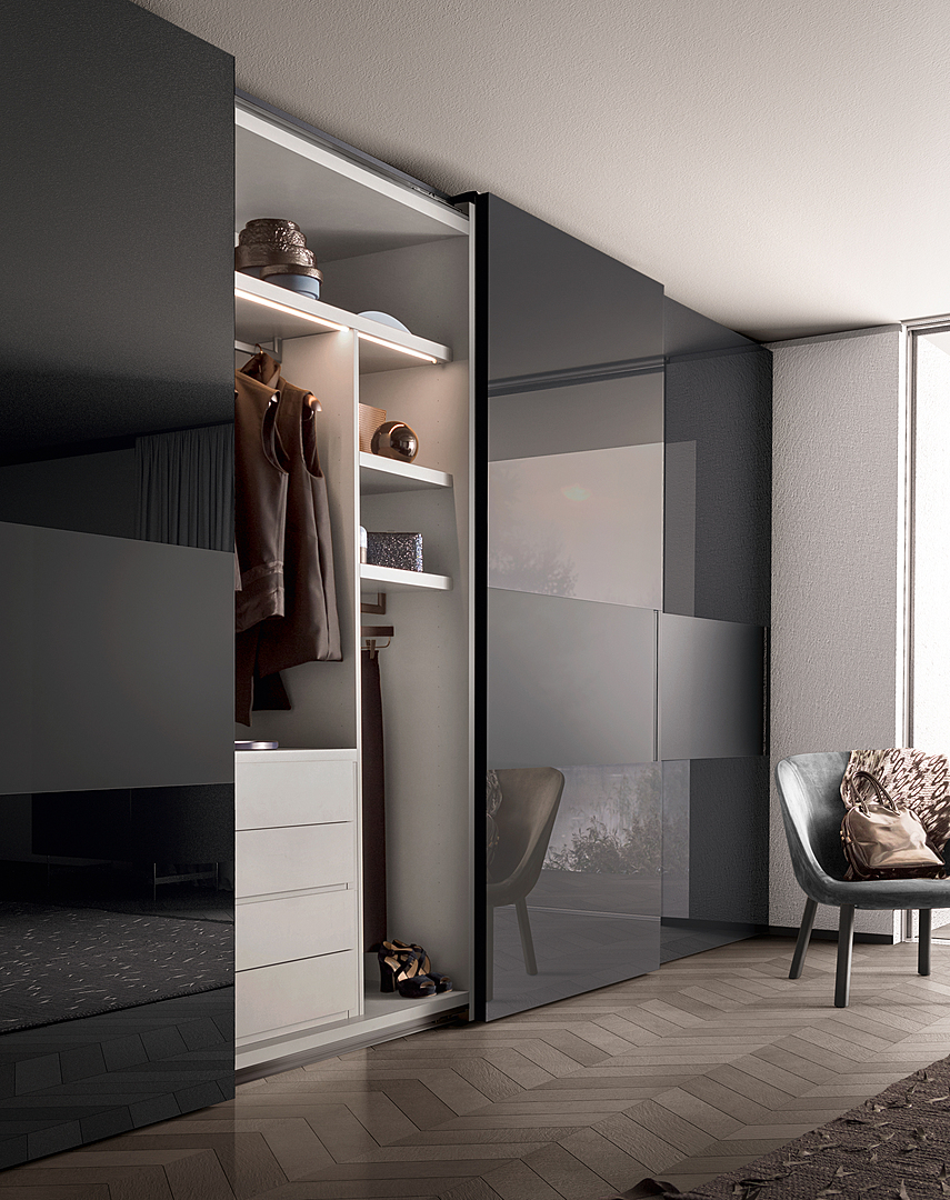 Harmony and elegance are punctuated by contrasting materials. Vela’s design inverts the typical vertical development of the door and suggests new visual effects. The central panels that interrupt the finish of sliding or flush sliding doors create three, horizontal bands. A contrast is achieved by choosing different lacquered or wood finishes for these bands. The vertical handle, carved out of the central panel, is available lacquered or in wood.