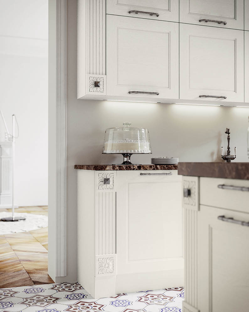 Base units, wall units and columns with solid wood white lacquer door. Marble top