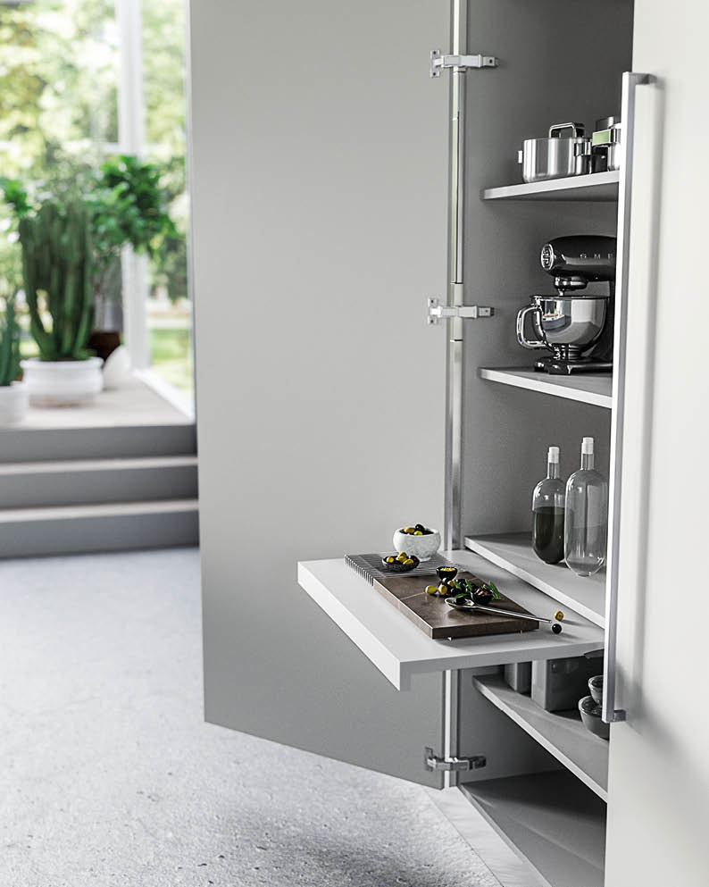 Columns and island in Fenix Grigio Efeso Snack bar in Greige finish.