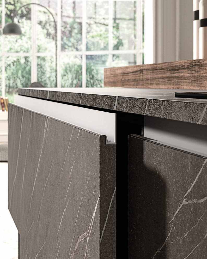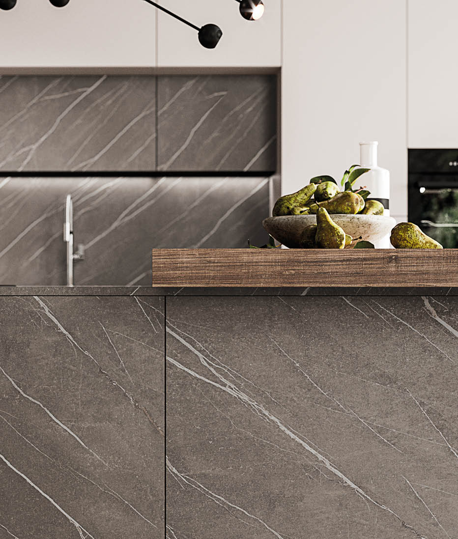 wall units, top and back in Akita HPL laminate. Slide snack bar top in Noce Vintage HPL laminate. Jay door profile in Fango matt lacquer.