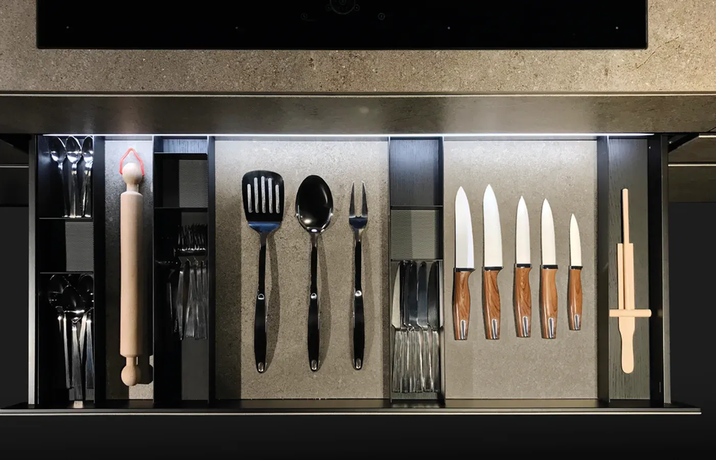 The Cut reinterprets the meaning of the kitchen environment, designing spaces laden with symbolic elements as well as functions essential to the dynamics of residential living. Each arrangement proposed has a tailored cut and creates a symbiotic relationship between the vital areas of the home, which penetrate each other through a co-ordinated image based on clean-cut, essential lines. Movement, space and interaction are the project’s three philosophical prerequisites, making the kitchen the place that changes most often over the course of the day – a fluid environment to reflect different lifestyles. The space thus becomes a receptacle of shared moments, which change with the time of day, situations and people present. The shapes clothe the space and address the needs, helping to enhance contacts and communication between people so that the pleasures of everyday life can be enjoyed.
