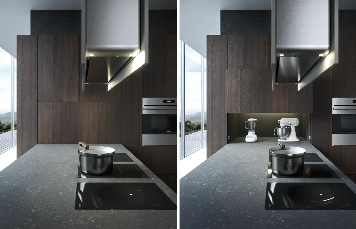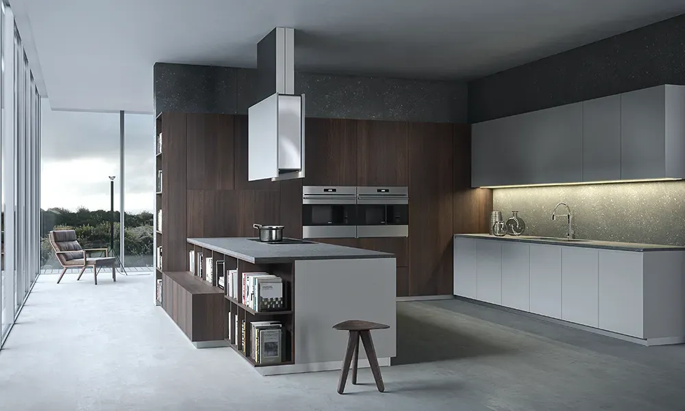 The Cut reinterprets the meaning of the kitchen environment, designing spaces laden with symbolic elements as well as functions essential to the dynamics of residential living. Each arrangement proposed has a tailored cut and creates a symbiotic relationship between the vital areas of the home, which penetrate each other through a co-ordinated image based on clean-cut, essential lines. Movement, space and interaction are the project’s three philosophical prerequisites, making the kitchen the place that changes most often over the course of the day – a fluid environment to reflect different lifestyles. The space thus becomes a receptacle of shared moments, which change with the time of day, situations and people present. The shapes clothe the space and address the needs, helping to enhance contacts and communication between people so that the pleasures of everyday life can be enjoyed.